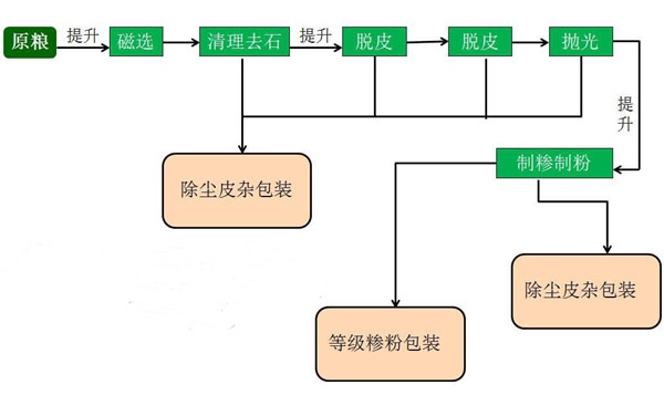 主要設備:組合清糧機,砂輥脫皮機,鐵輥脫皮拋光機,超精制粉機,超精制糝機,刷粉機